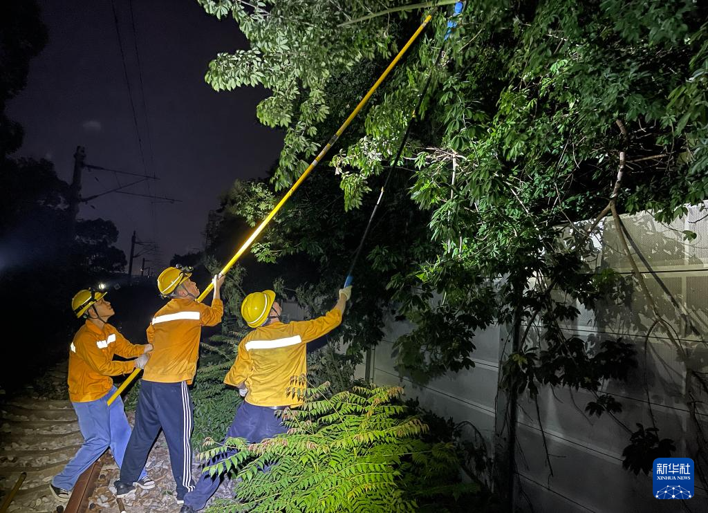 9月6日凌晨,钦州供电段接触网工人在巡查清理铁路沿线树枝。