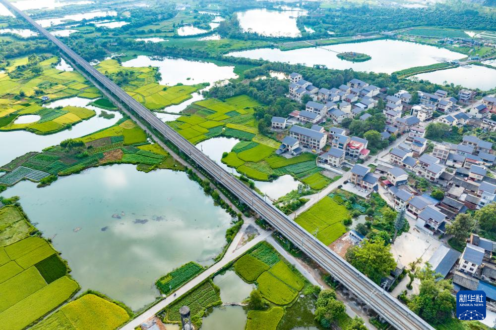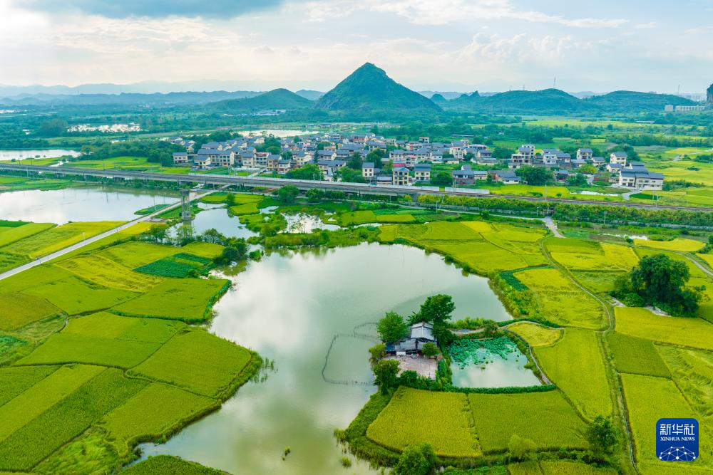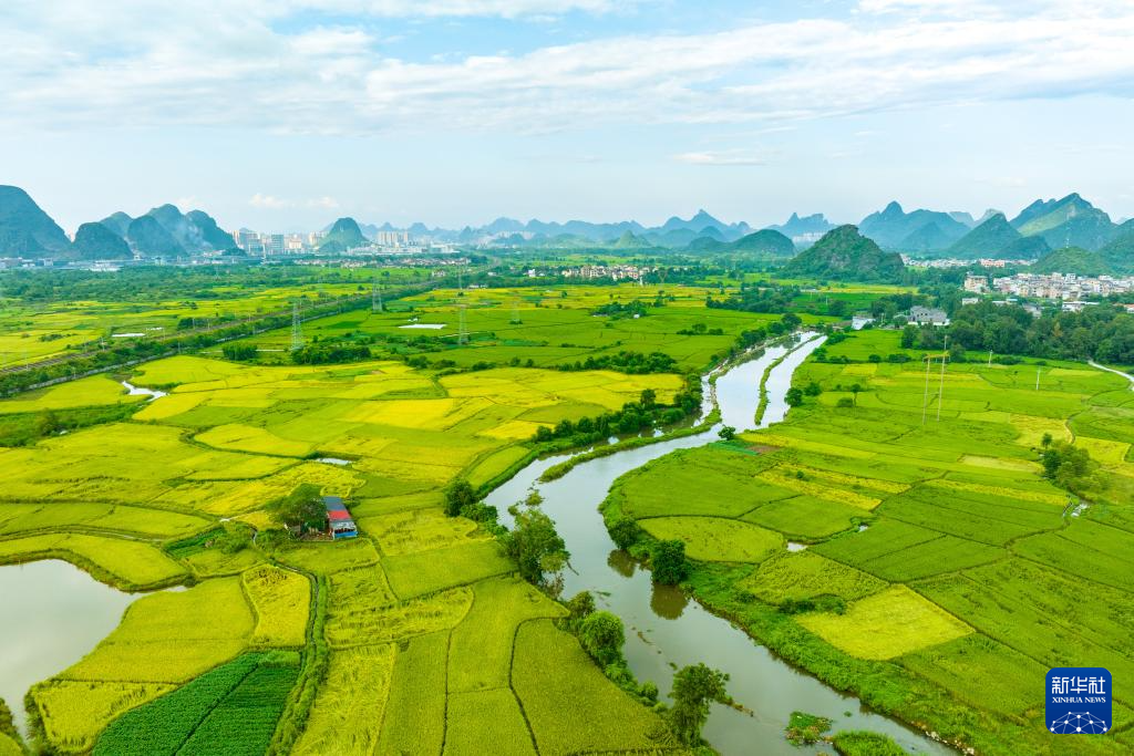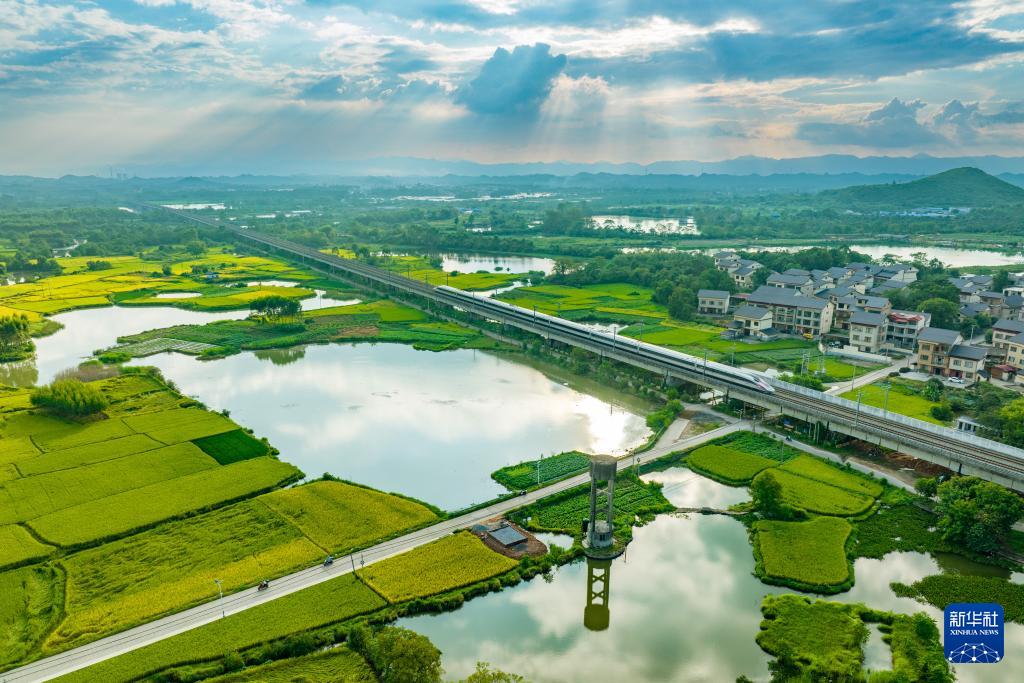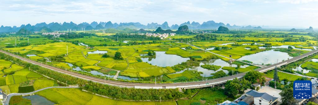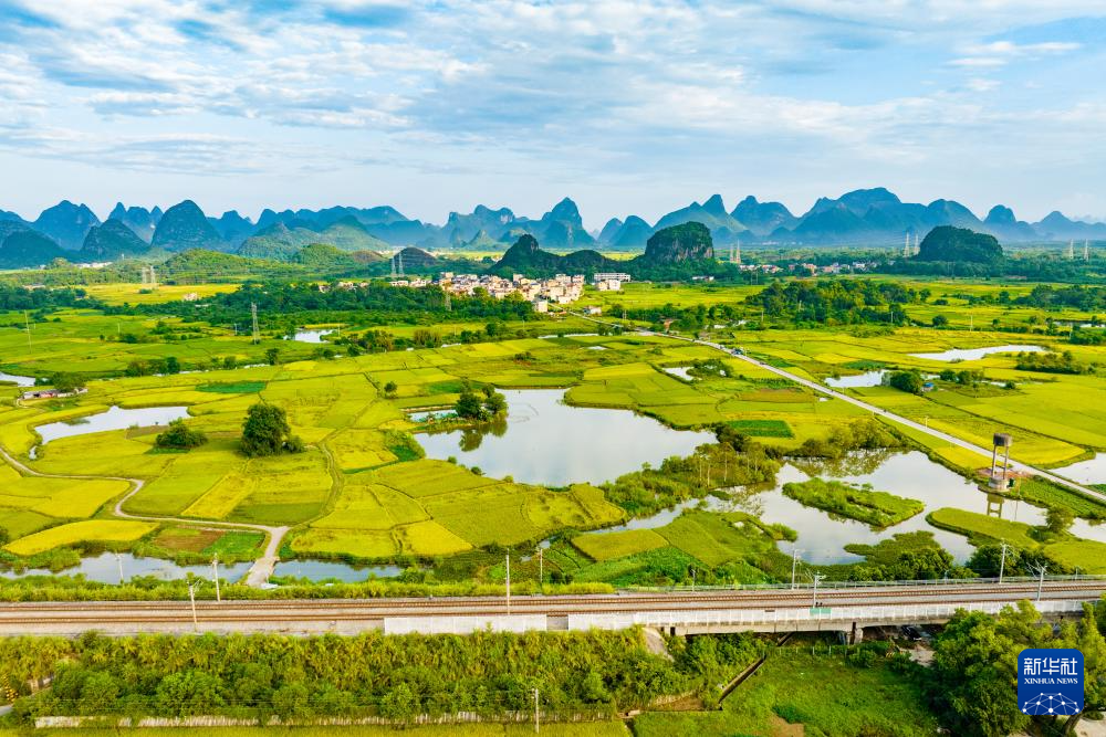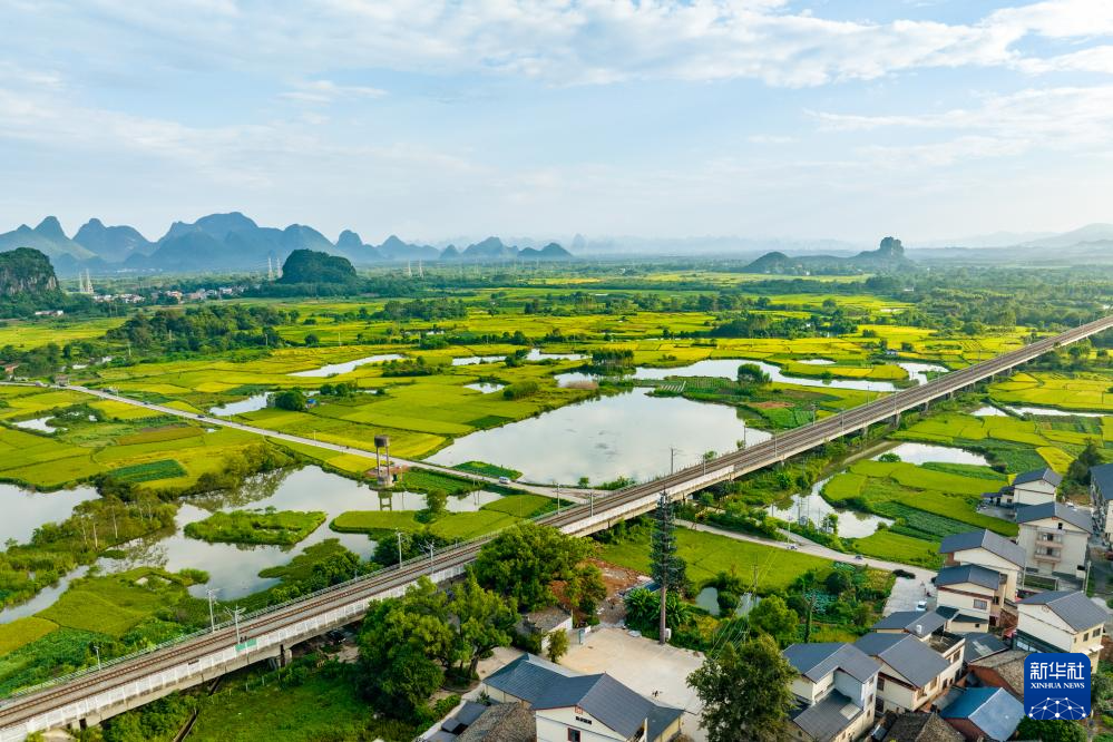 2024年9月16日,在广西桂林市临桂区四塘镇太平村,湿地、田园、村庄、铁路、晚霞相映成趣,一幅秀美的乡村秋色画卷展现在眼前。近年来,当地持续推进农村环境综合整治,大力发展农村经济,农村处处呈现出产业兴、乡村美的新画卷。