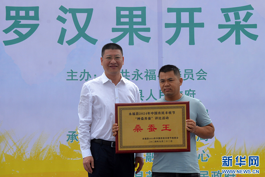 永福县委副书记、代县长陆铁拓(左)为“桑蚕王”颁发牌匾