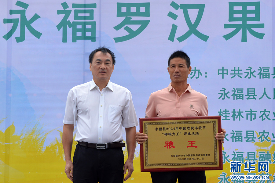 桂林市农业农村局副局长魏承林(左)为“粮王”颁发牌匾