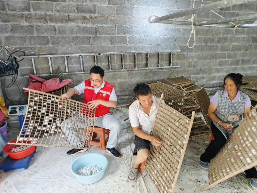 驻村第一书记李林(左一)与群众一起收蚕茧