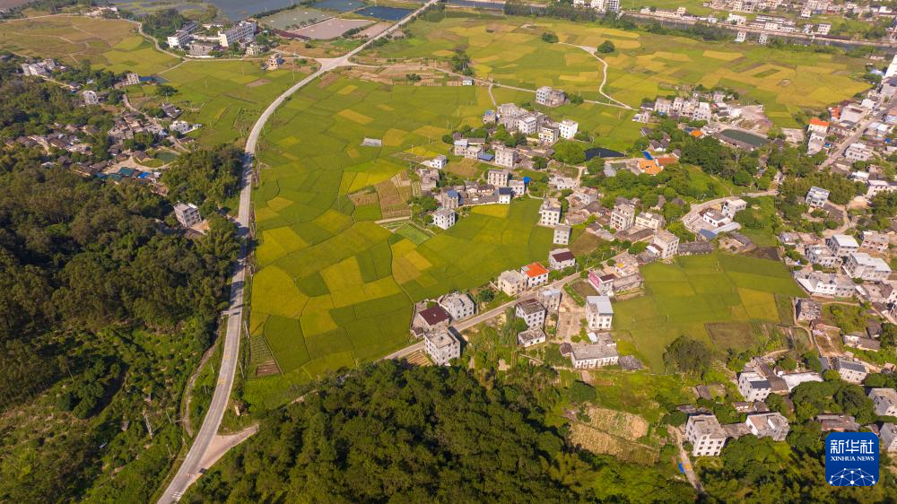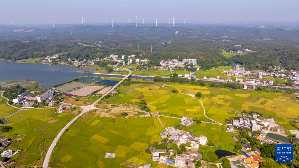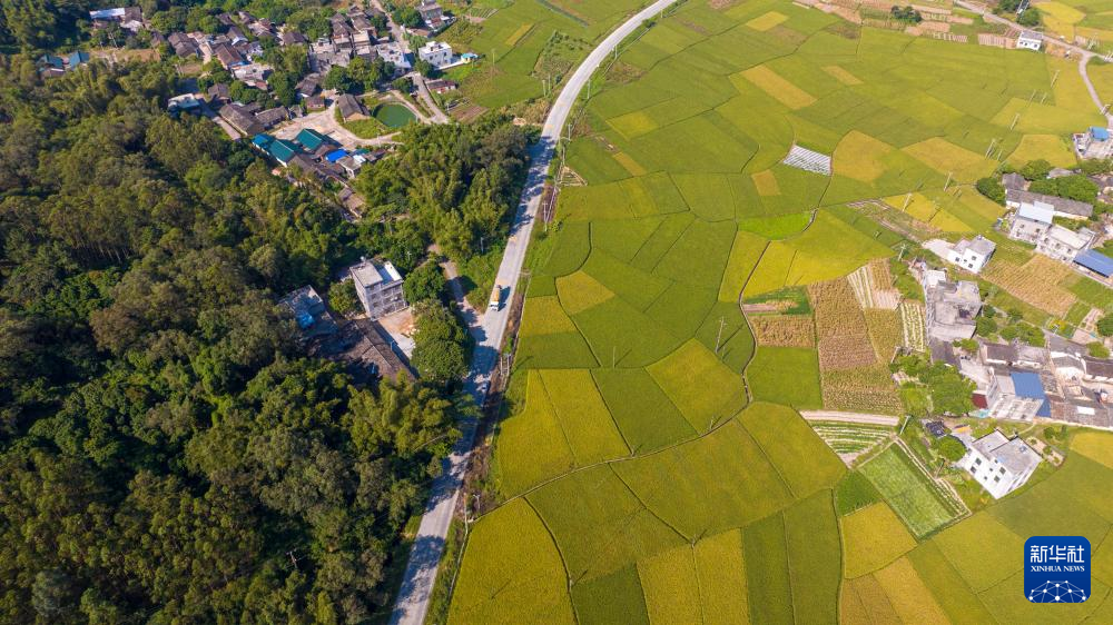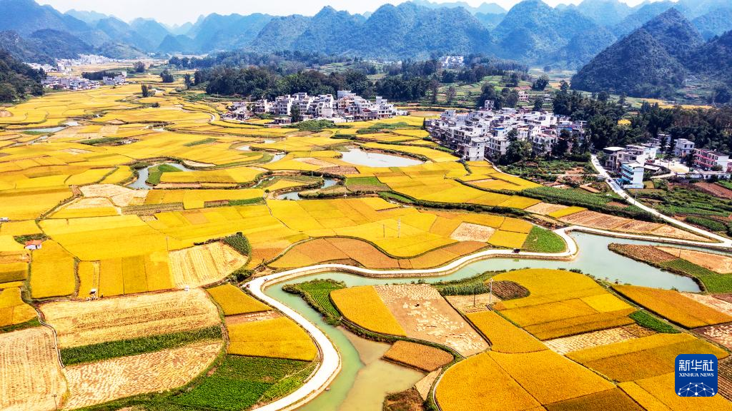 金秋时节,乡间农田与河流、群山、村落相互映衬,一步一景,美不胜收。