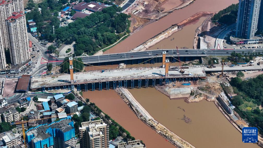 这是正在建设中的平陆运河沙井钦江大桥,旁边的是临时保通桥(10月11日摄,无人机照片)。