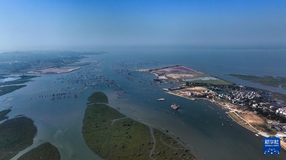 在钦州市沙井入海口,施工船在疏通平陆运河航道(10月11日摄,无人机照片)。