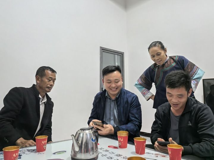 在村民田学军(左一)家中,农前朝(左二)和村民查看手机中的咖啡树照片。新华每日电讯记者 徐海涛 摄