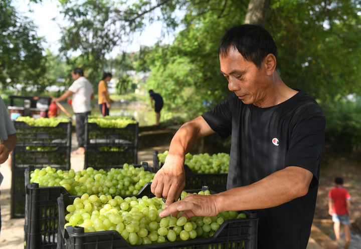 在广西全州县才湾镇毛竹山村,当地村民在分拣刚刚收摘的葡萄。新华社记者陆波岸摄