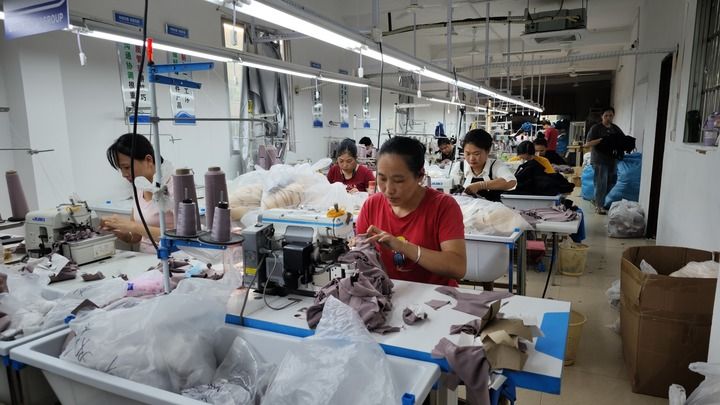 在丹竹镇丹竹村的一家运动服饰厂,工人们正在加工服装。新华每日电讯记者 杨驰 摄