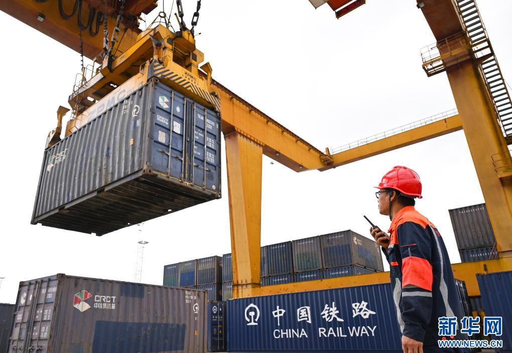在广西南宁国际铁路港,吊车装卸经铁路运输的货物集装箱。每天都有来自西部省份满载货物的班列在广西南宁国际铁路港集合,通过多式联运接续中越班列驶往越南(10月19日摄)。