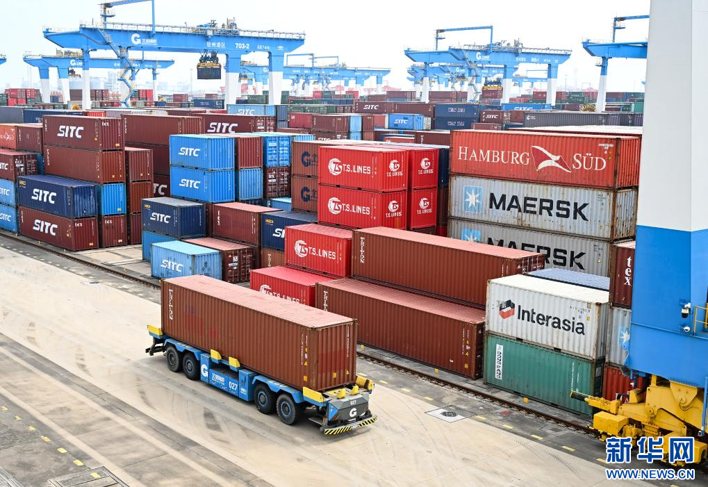 在广西北部湾港钦州港区码头,一辆自动化无人转运车在运送集装箱。各式各样运往东盟各国的货物在这个海铁联运自动化集装箱码头实现“下船即上车、下车即上船”(10月20日摄)。