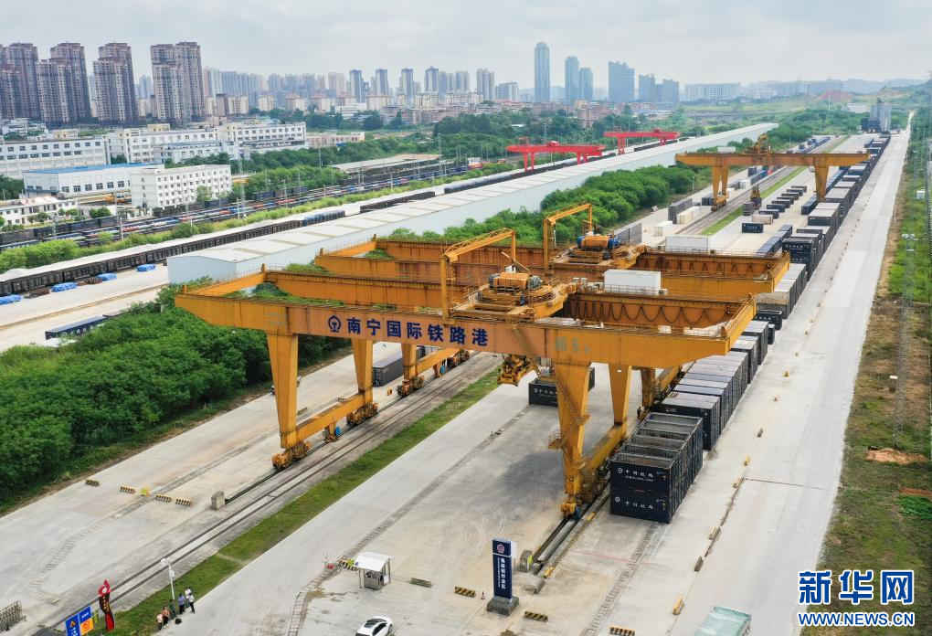 南宁国际铁路港是西部陆海新通道上的重要枢纽。每天都有来自西部省份满载货物的班列在此集合,通过多式联运接续中越班列驶往越南(10月19日摄,无人机照片)。