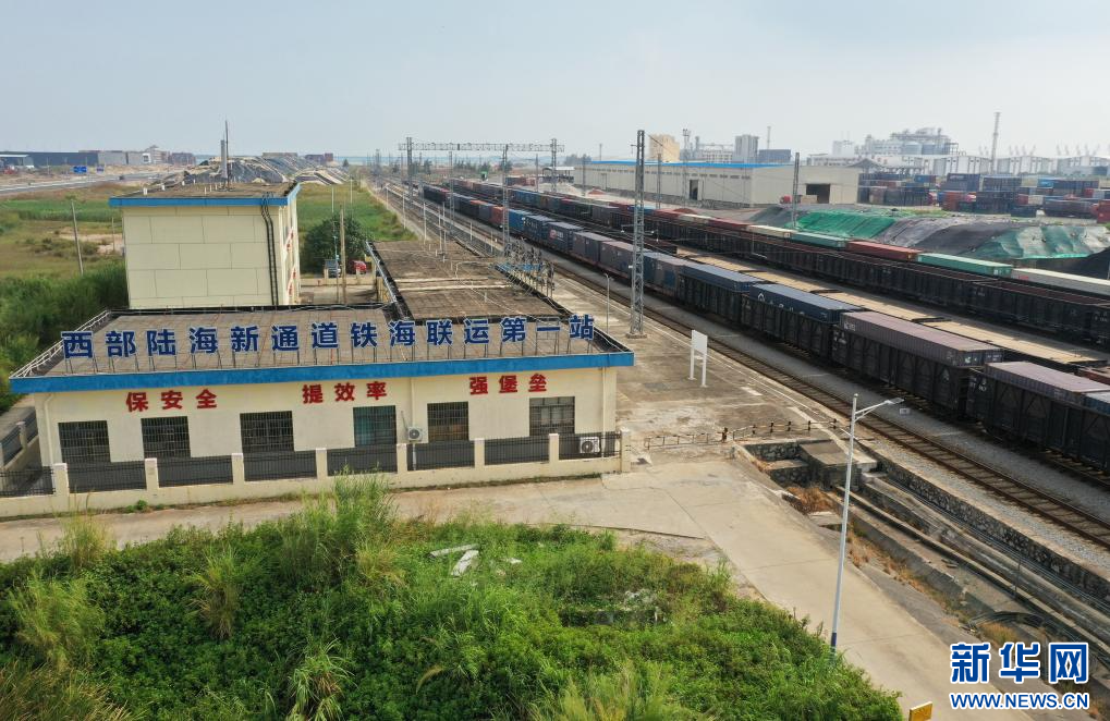 在广西钦州港东站,开往东盟多国的铁海联运班列等待出站(10月20日摄,无人机照片)。