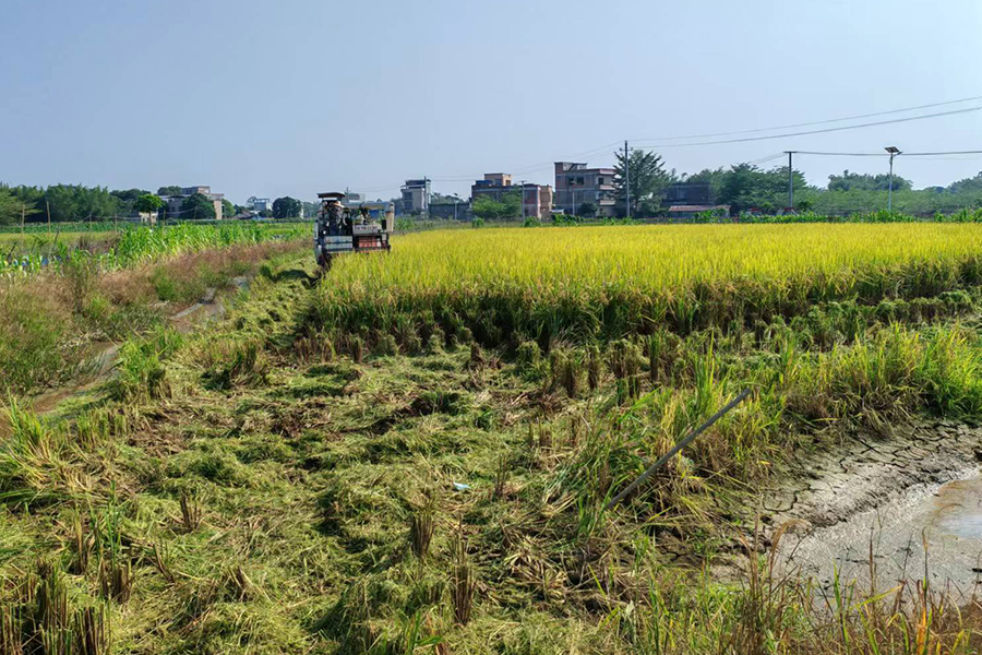 正值丰收季,在广西桂平市南木镇中桥村一片金色稻田里,割穗、脱粒、秸秆分离、装车……一派秋收的忙碌景象。