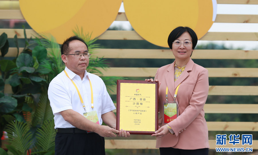 自治区气象局副局长韦定宁(左)向容县颁发中国《节气名特优产品名录》证书及牌匾,容县县委书记罗莉(右)接受证书及牌匾。(新华网发 周敏 摄)