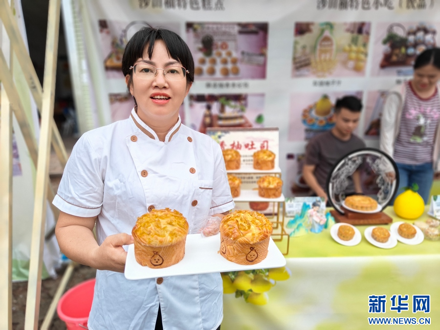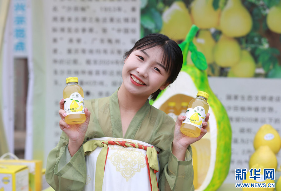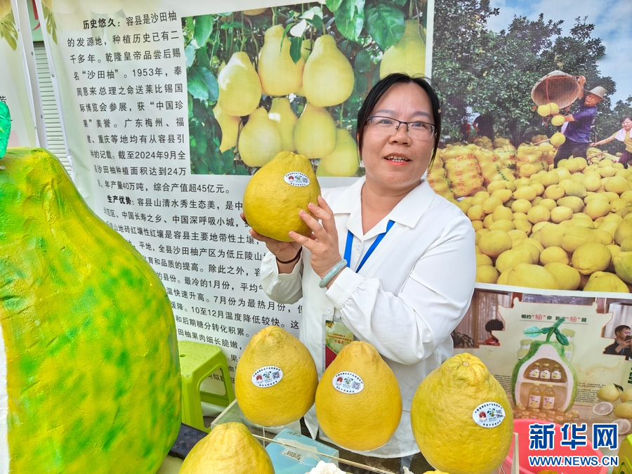工作人员展示沙田柚深加工产品。(新华网发 周敏 摄)