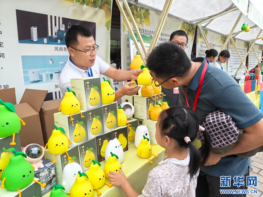 工作人员向顾客介绍沙田柚文创产品。(新华网发 周敏 摄)