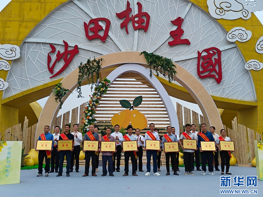 与会嘉宾为获得2024年容县沙田柚质量评比“十佳沙田柚”的种植户颁奖。(新华网发 周敏 摄)