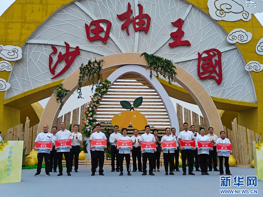 与会嘉宾为获得2024年玉林市职工职业技能大赛沙田柚特色美食烹制技能竞赛的获奖者颁奖。(新华网发 周敏 摄)