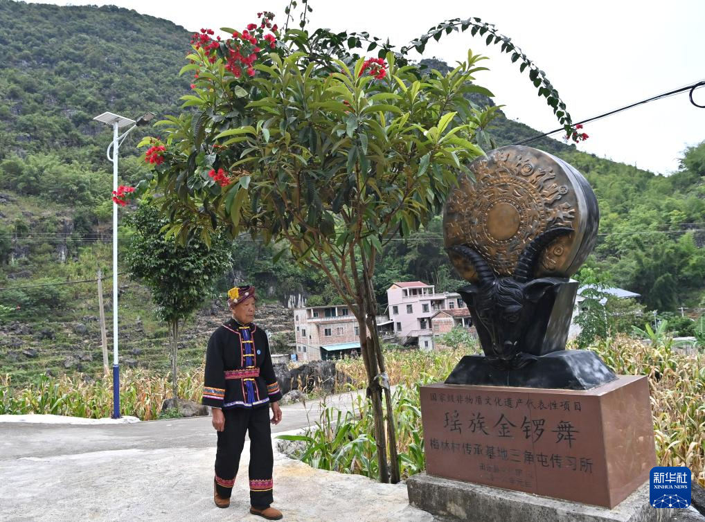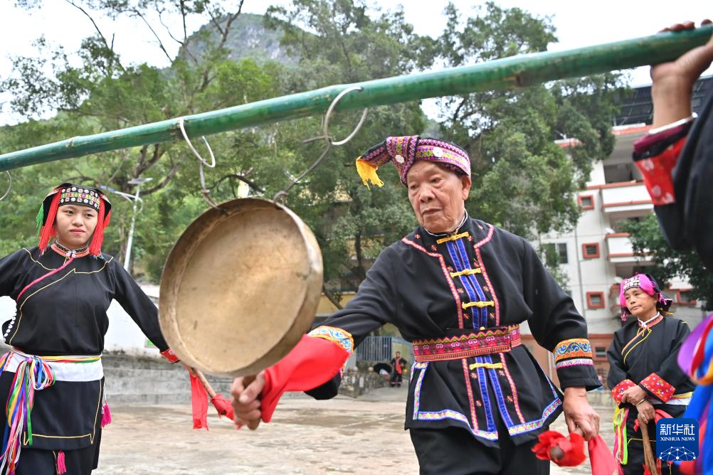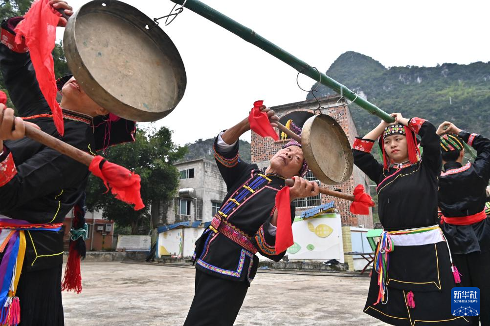 阮桂陆(右)和艺术团成员在田东县作登瑶族乡梅林村表演金锣舞(10月28日摄)。