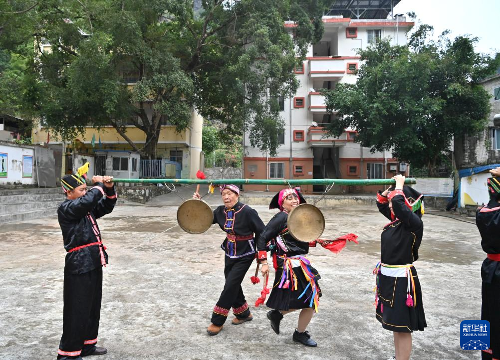 阮桂陆(左)和艺术团成员在田东县作登瑶族乡梅林村表演金锣舞(10月28日摄)。