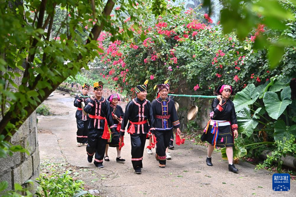 梅林村瑶族金锣舞艺术团的成员行走在村道上,准备去排练(10月28日摄)。