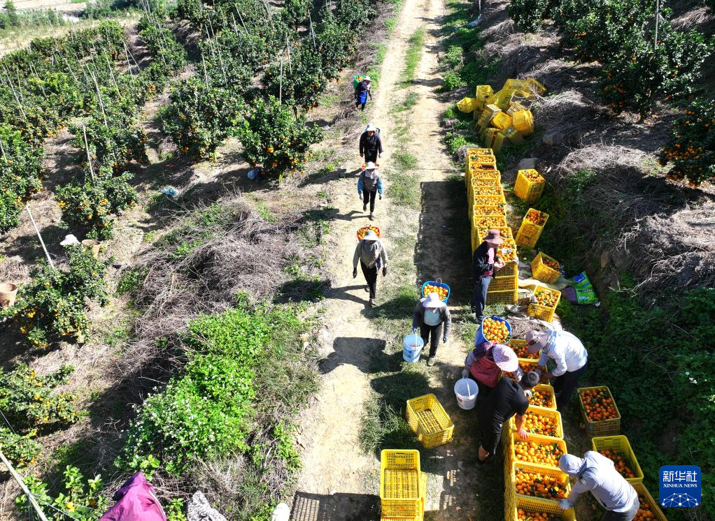 10月30日,村民在西林县那劳镇洞坚村采摘金秋沙糖桔(无人机照片)。