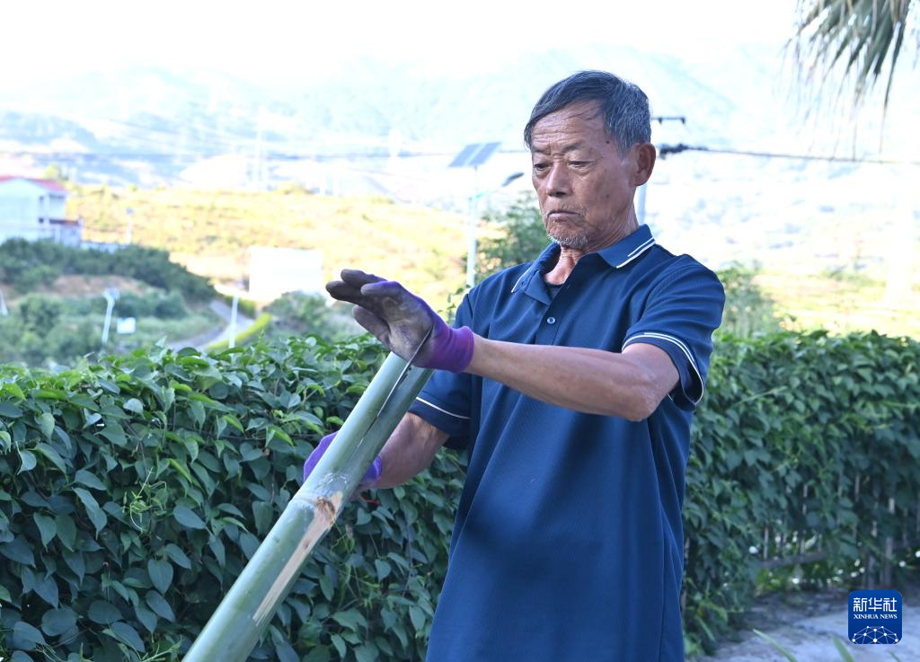 冯光明在广西百色市西林县普合苗族乡大河村破开竹子(10月29日摄)。