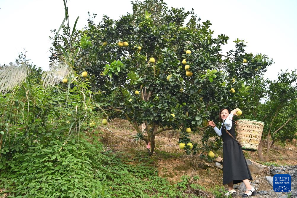 冯光明的女儿在广西百色市西林县普合苗族乡大河村用父亲编的背篓装柚子(10月29日摄)。