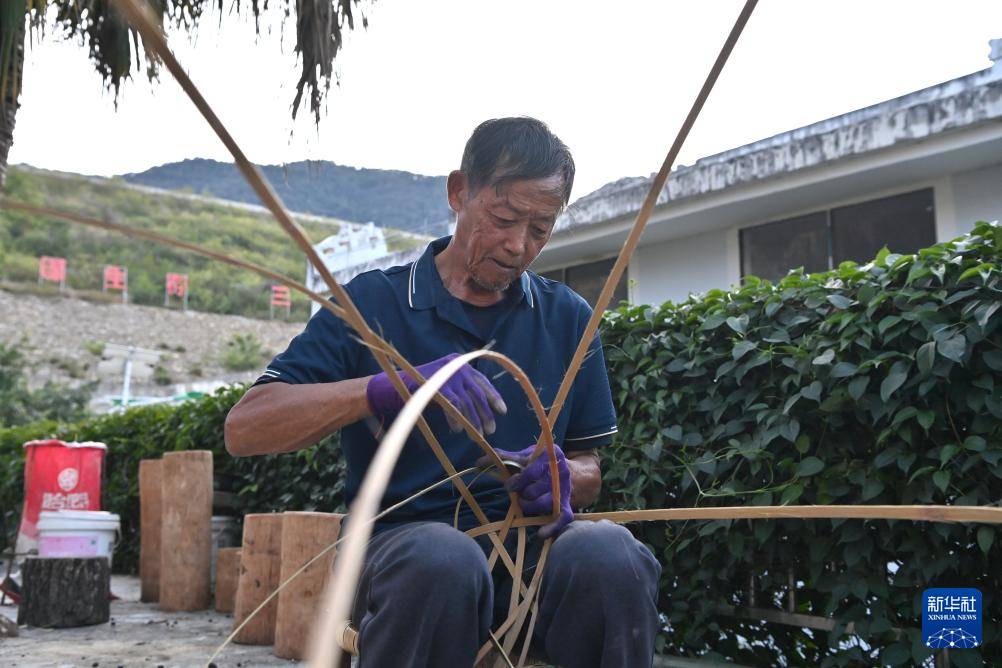 冯光明在广西百色市西林县普合苗族乡大河村编竹鸟(10月29日摄)。