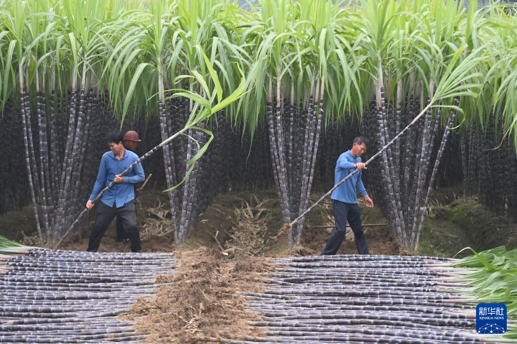 金秋时节,广西柳州市柳江区百朋镇果蔗种植基地迎来收获季,蔗农们积极收割抢运,加紧供应市场。