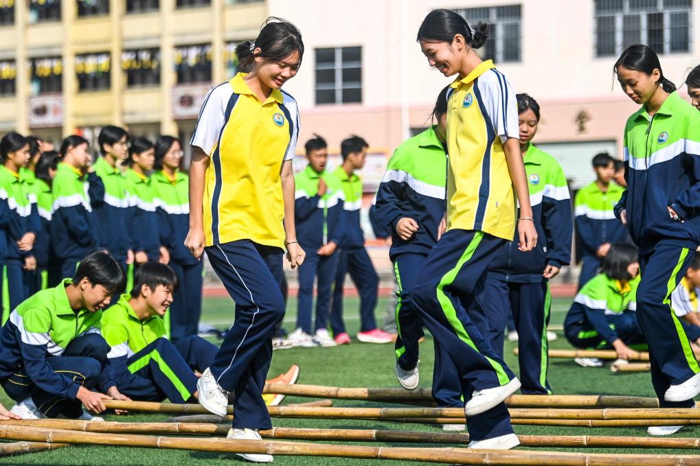 11月6日,广西玉林市民族中学的学生们在跳竹竿舞
