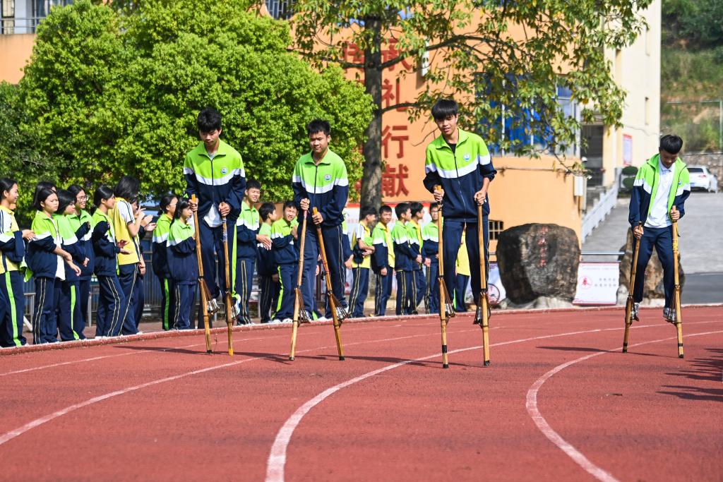 11月6日,广西玉林市民族中学的学生们在进行高脚竞速比赛