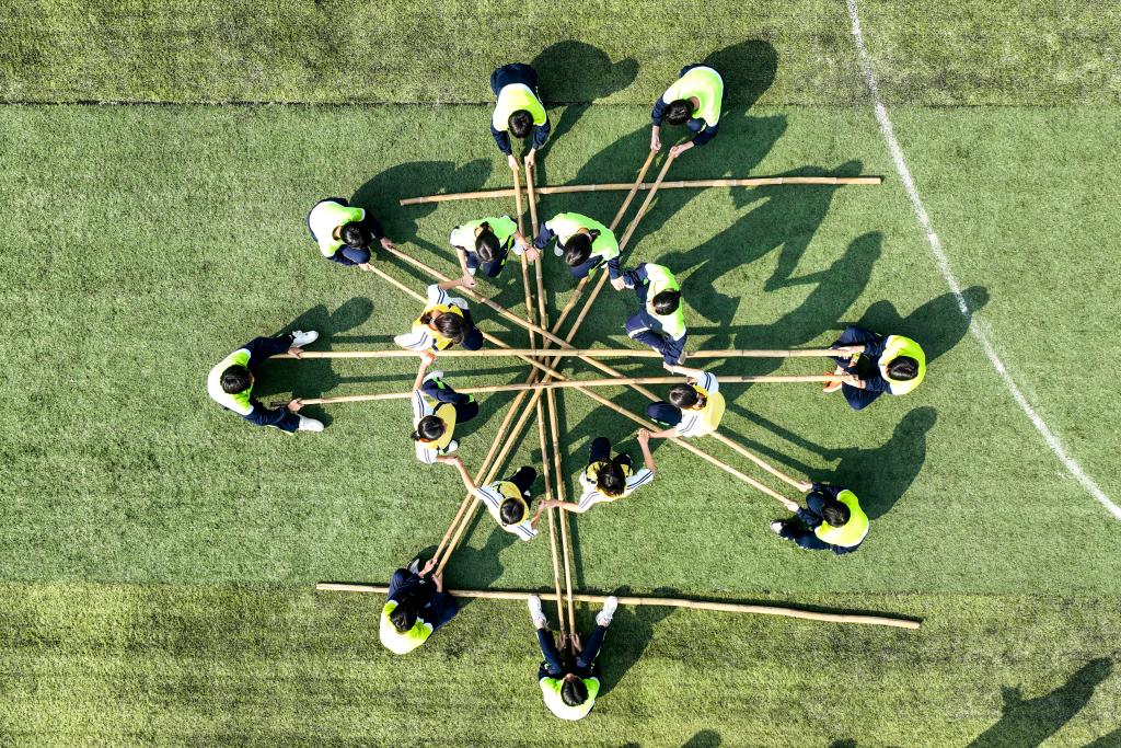 11月6日,广西玉林市民族中学的学生们在跳竹竿舞(无人机照片)