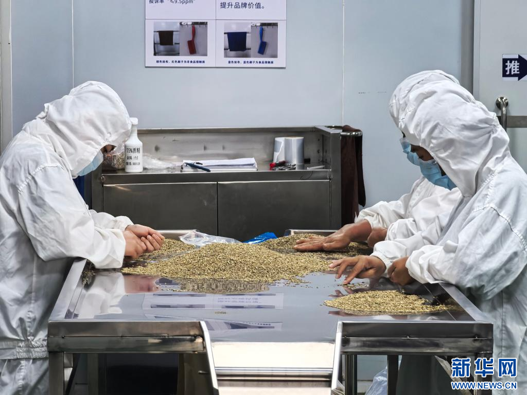 在宝硕公司生产车间内,工人在分拣小茴香。新华社记者 王楚然 摄