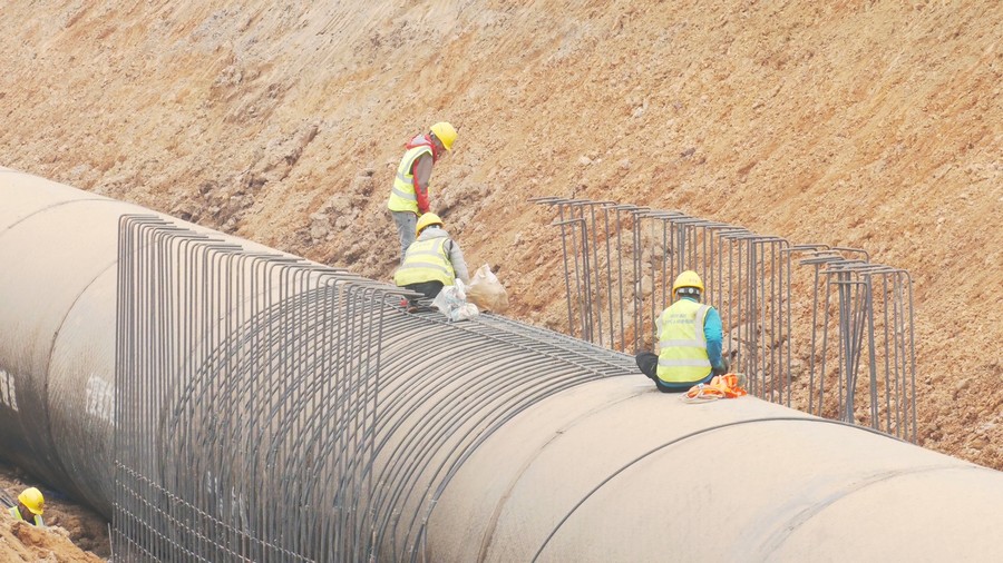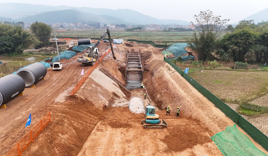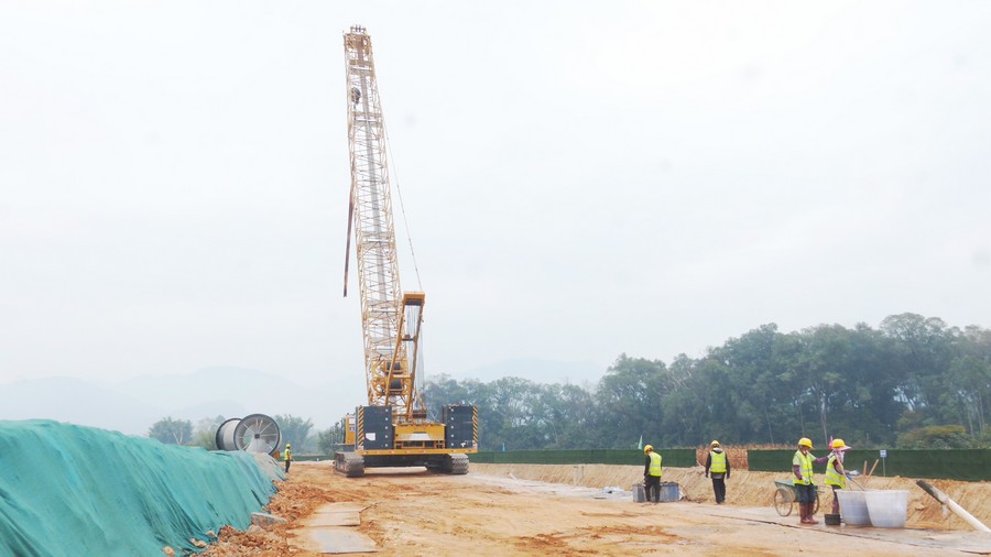 近日,在广西贵港桂平市石龙镇永兴村大藤峡水利枢纽灌区工程达开灌片项目的施工现场,大型起吊机轰鸣,施工人员正忙着焊接钢筋,各项工作正有条不紊地开展。