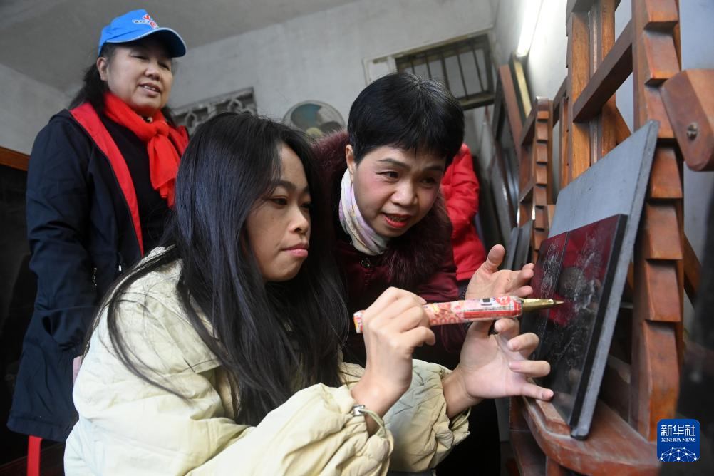 12月12日,在广西南宁市邕宁区蒲庙镇,刘雪山(右)指导爱好者进行创作。