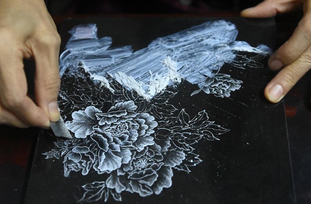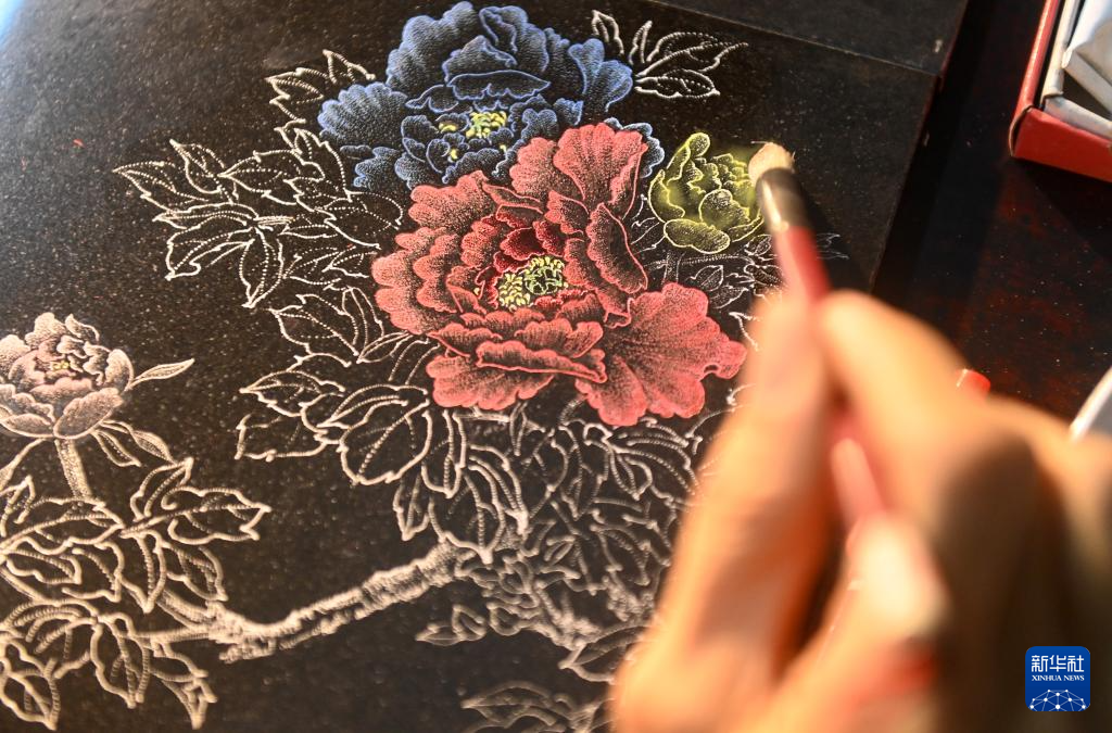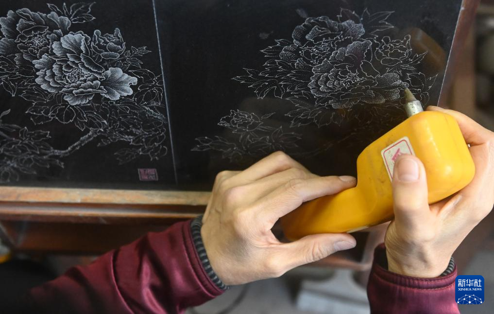 刘雪山在石头上“作画”运用的是刘记石雕制作技艺,是南宁市级非物质文化遗产代表性项目,其制作过程主要是采用花岗岩等纯色石材,经过水磨抛光后,在磨光面上把要雕琢的图像轮廓描绘出来,根据黑白明暗成像原理,用钢凿、钢錾等工具,通过运用腕力调节针点疏密、粗细、深浅和虚实变化来呈现图像,创作作品。