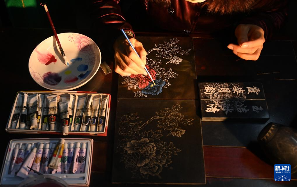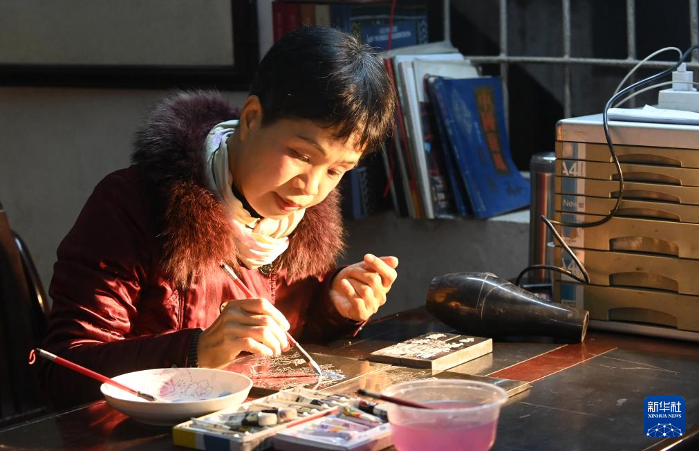 12月12日,在广西南宁市邕宁区蒲庙镇,刘雪山在给作品上颜色。