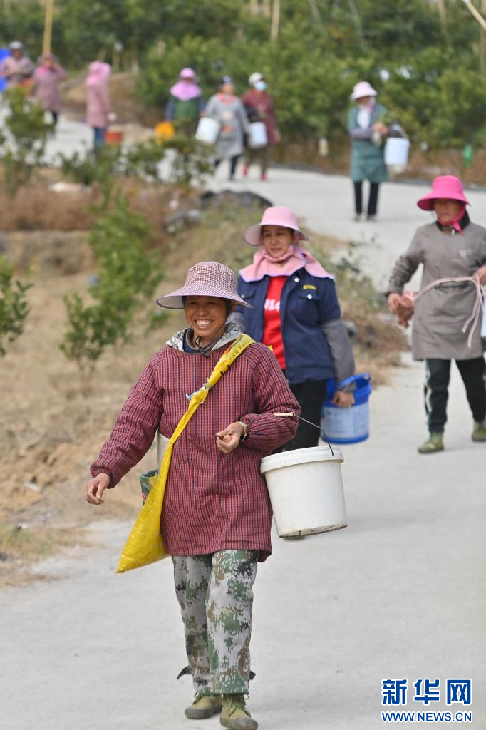 在柳州市柳江区土博镇水源村,完成采摘工作的妇女们走出金桔园(12月18日摄)。