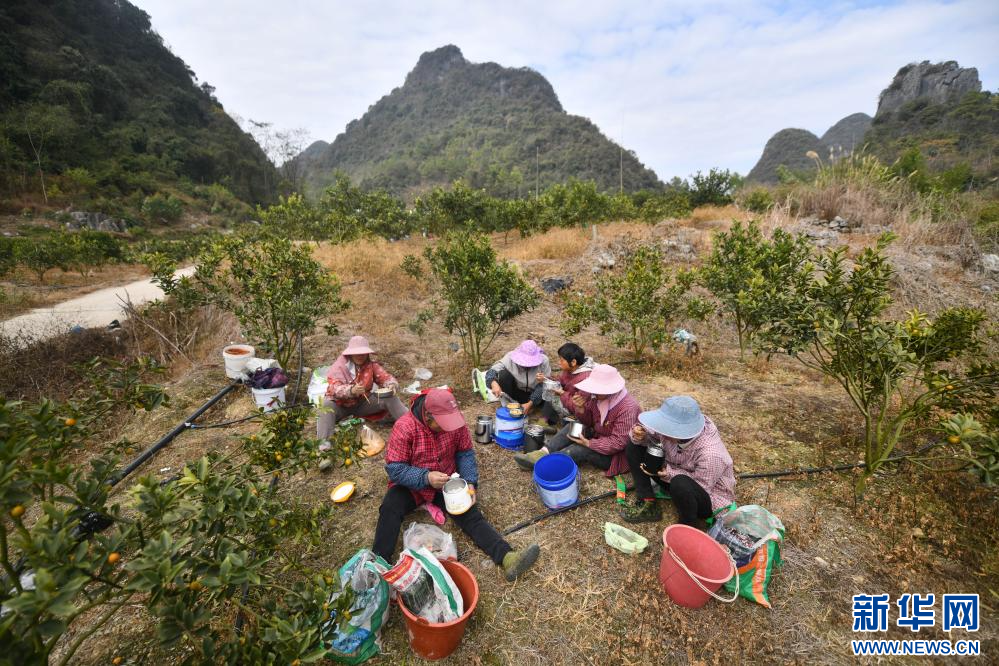 采摘金桔的妇女们在柳州市柳江区土博镇水源村吃午饭(12月18日摄)。