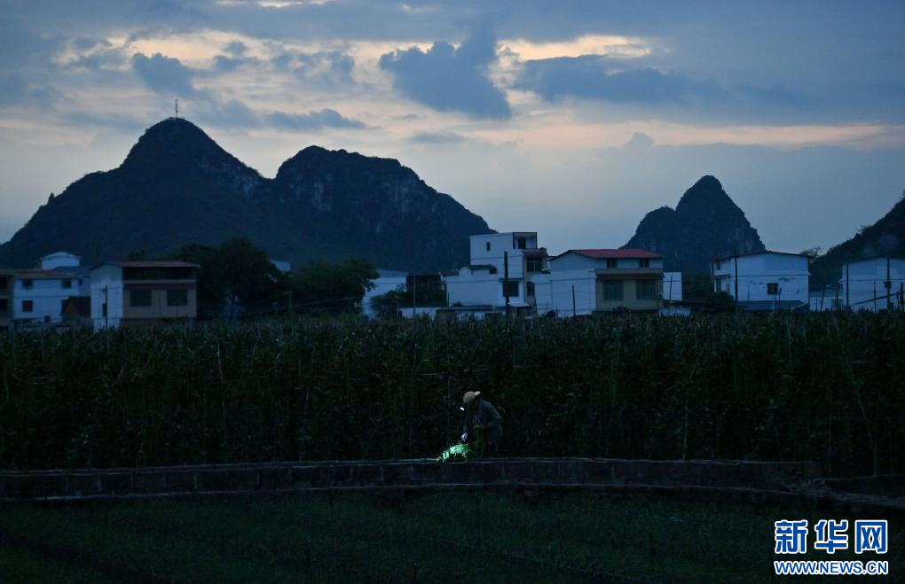 清晨,一名妇女在柳州市柳江区三都镇觉山村采收豆角(10月20日摄)。