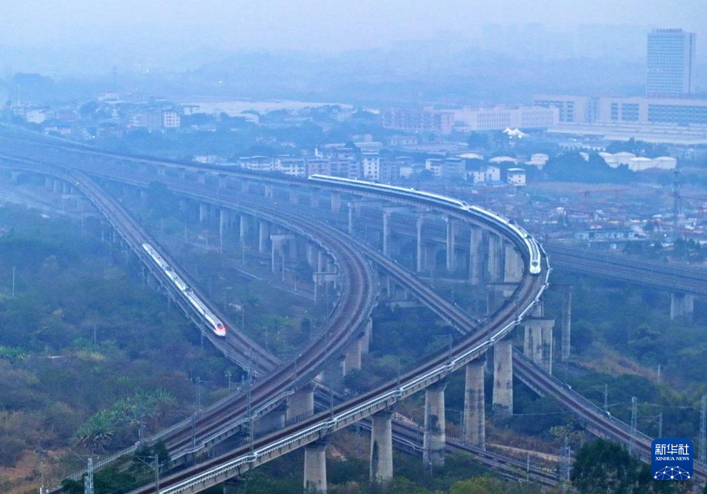 列车(右)行驶在南珠高铁南玉段屯里大桥上(2024年12月30日摄,无人机照片)。
