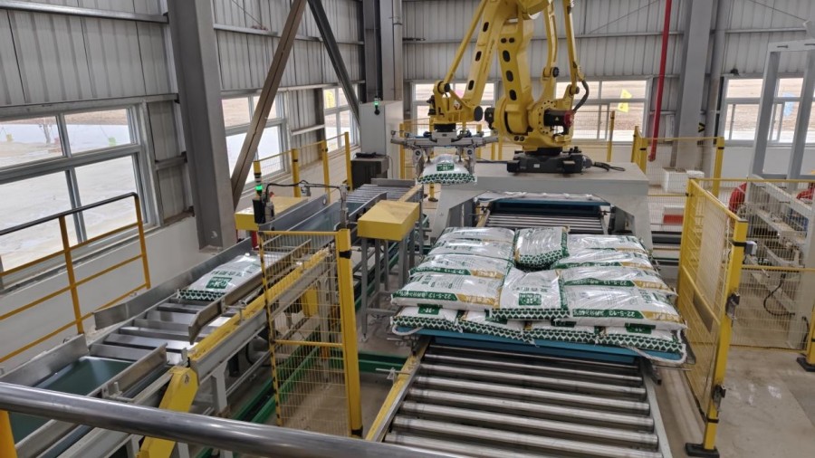 在心连心复合肥项目(一期)现场,自动化机器正在轮番作业,从生产厂房到成品库,各道工序、各个环节紧密配合,有条不紊进行。在成品库间,一袋一袋复合肥通过自动化运输带输送到仓库区,成品间叠放整齐的成品复合肥正等待着货车装载运往各地。