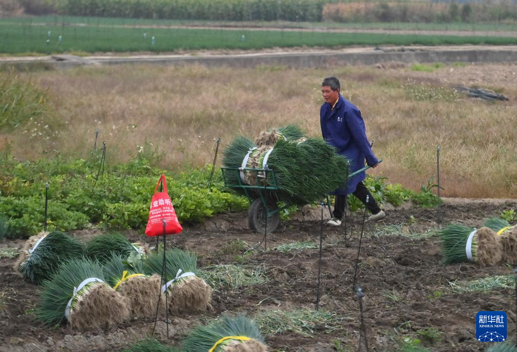 2024年11月3日,觉山村村民在田间搬运香葱。