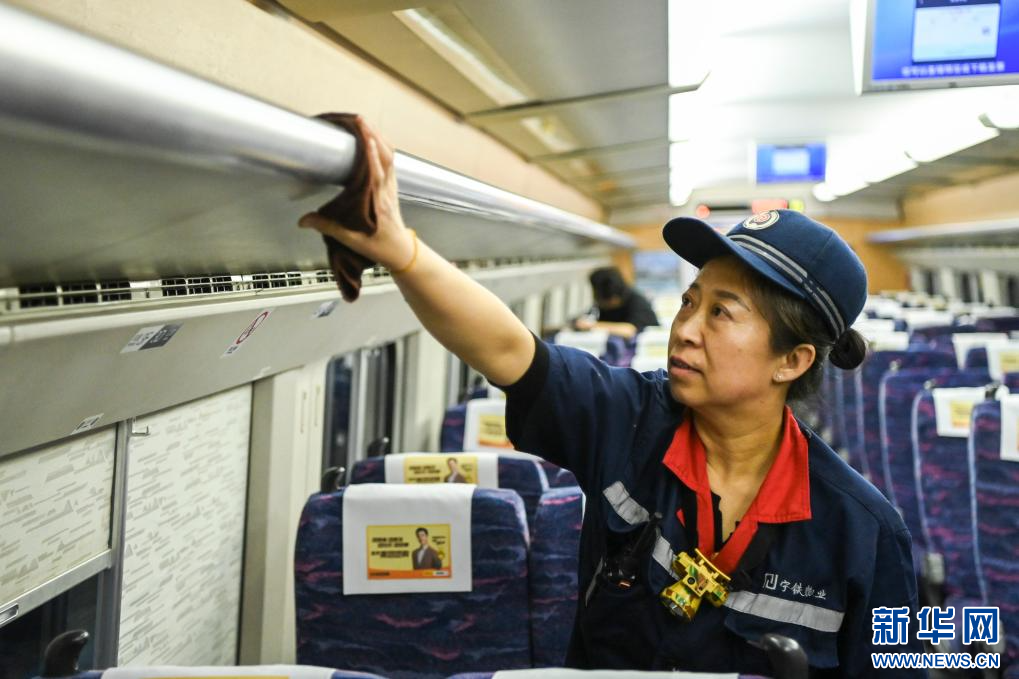 1月14日,在中国铁路南宁局集团有限公司南宁车辆段南宁动车所,工作人员对车内进行清洁。