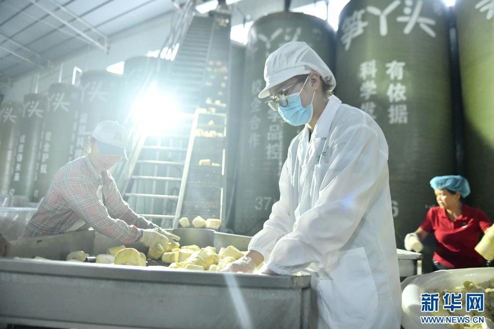 颜茜茜(中)在酸笋加工厂生产线上加工竹笋