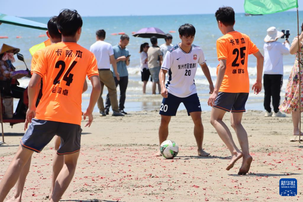 球员们在海边的滩涂上踢球。(东兴市融媒体中心供图)