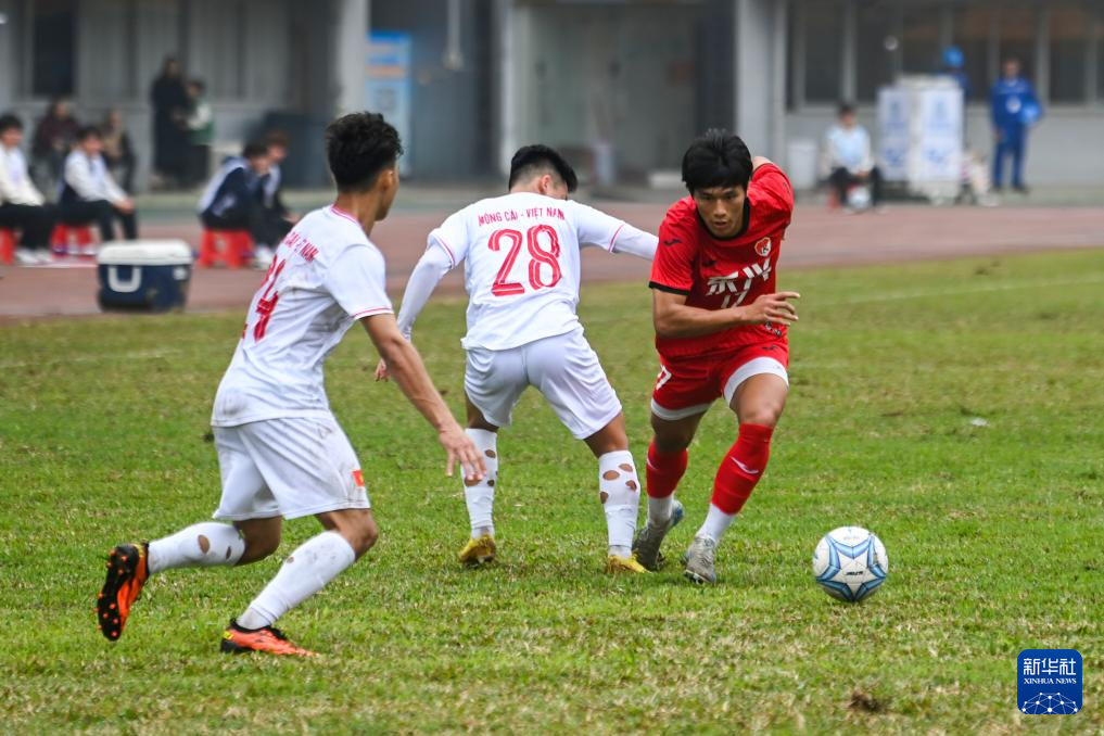 2月12日,越南芒街队球员武文勇(左二)在比赛中拼抢。新华社记者 曹祎铭 摄
