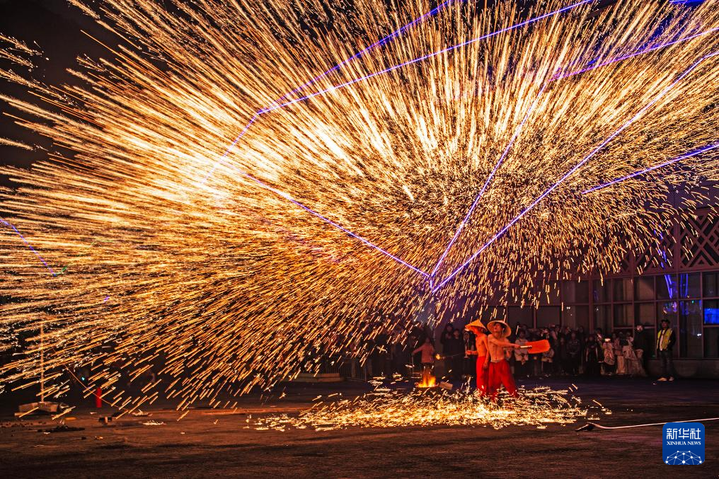 2月12日,农历正月十五元宵节,民间艺人在广西壮族自治区靖西市进行非遗“打铁花”表演。