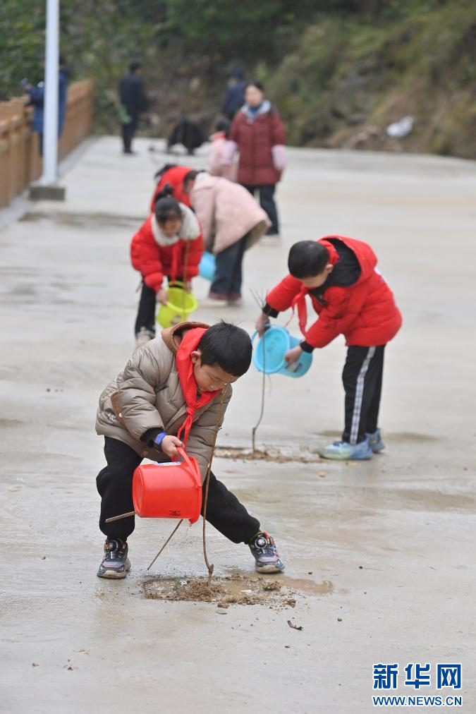 2月26日,在融水苗族自治县杆洞乡党鸠村,参加植树活动的小学生给树苗浇水。