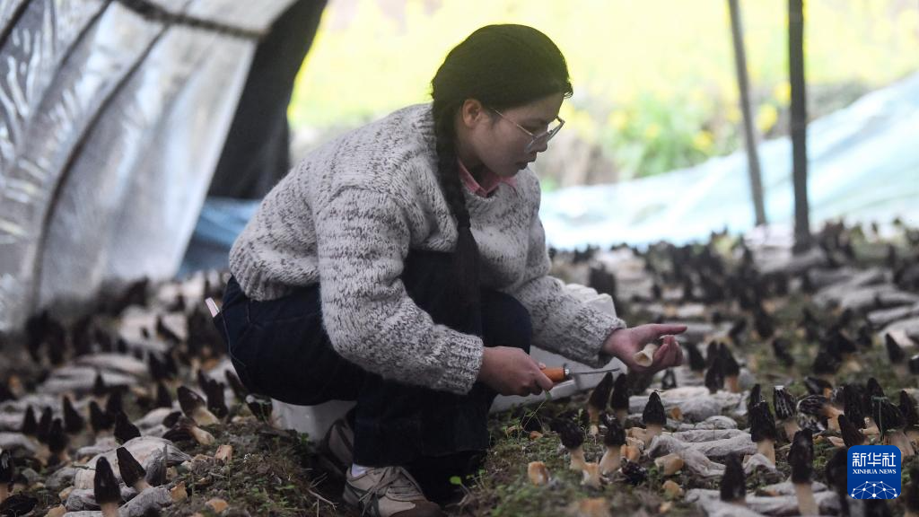 2月28日,在广西三江侗族自治县丹洲镇江荷村,一名年轻人在采收羊肚菌。